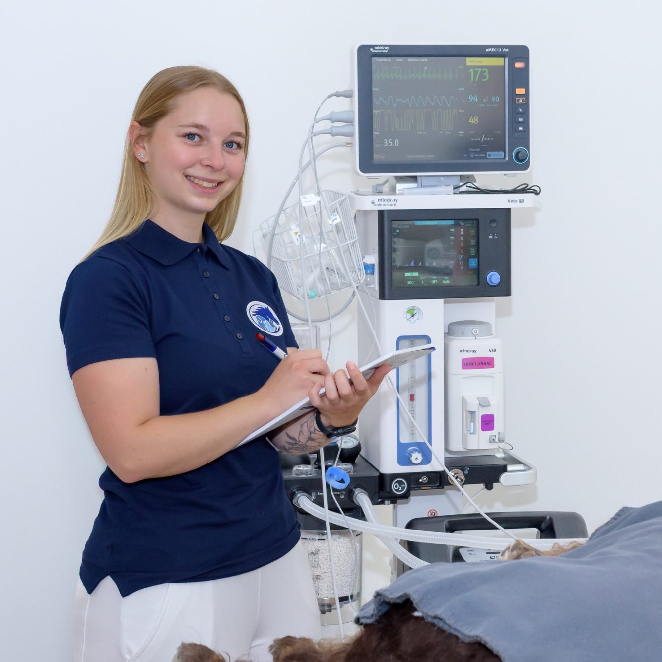 Währenddessen entwickelte sich ein großes Interesse im Bereich der OP-Assistenz und Kleintieranästhesie. Nach erfolgreich beendeter Ausbildung im Juli 2023 absolvierte Anna von März 2024 bis Januar 2025 den Kleintieranästhesie-Zertifikats-Lehrgang der ESAVS (European School of Veterinary Advanced Studies) und erwarb somit die Zusatzqualifikation „Assistenz in der Kleintieranästhesie“. Seitdem begleitet sie Operationen, leitet und überwacht Narkosen und sorgt sich um das Wohlergehen der Patienten nach einem Eingriff.